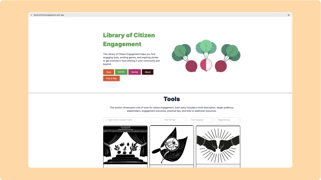 The Library of Citizen Engagement is a catalogue of practical resources to make food sharing more participatory and inclusive. It features a variety of tools, games, and stories that showcase how different groups have successfully engaged citizens. The Library highlights the benefits of collaboration between communities, policymakers, researchers, and artists, helping to reduce barriers and inspire action toward sustainable food systems.